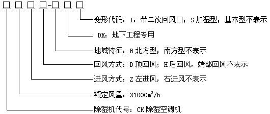 型號示例: CK12-DX 表示名義風量為12000m3/h,回風方式為端部回風的南方型地下工程用除濕空調(diào)機,面對機組控制器,回風口在右側。