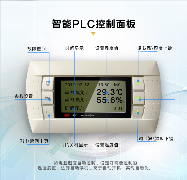 3、高性能電子電極加濕器:不滋生細(xì)菌,對室內(nèi)空氣無污染;對水質(zhì)無特殊要求,無需水處理;獨立加濕器控制板,自動定時換水清洗,延長使用壽命,能自動根據(jù)加濕要求控制水位及加濕電極電流,實現(xiàn)高精度控制,真正滿足高精度要求;